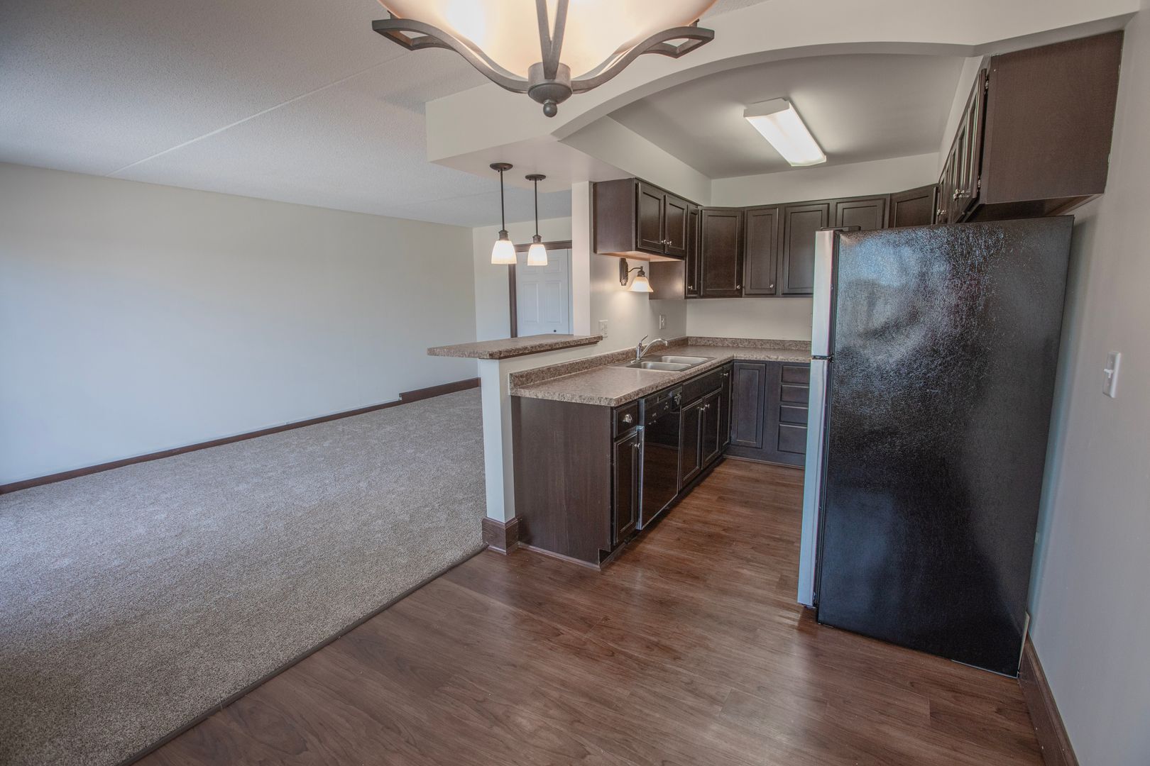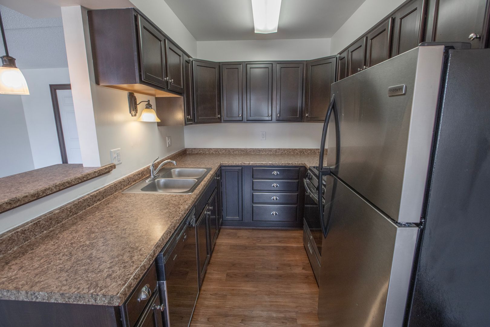 Our Contemporary One Bedroom features stainless steel appliances including refrigerator, gas range, dishwasher and microwave, faux granite counters, contemporary cabinets and vanity, walk in shower neutral colored carpet, ceiling fans, ample closet space, plenty of natural light with many windows, and more!